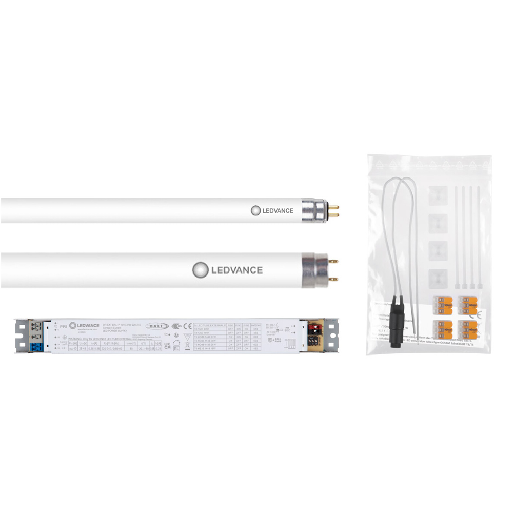 Gibt es keine Retrofit-Alternative oder stehen maximale Effizienz und geringer Wartungsaufwand im Fokus, ist Umverdrahtung die Lösung. Auch hierfür gibt es verschiedene Lösungen. Die perfekte Lösung zur Umstellung einer dimmbaren DALI-Installation auf dimmbare LED-Technologie ist das LED Tube External System aus LED-Röhre und externem Treiber – Ledvance.de/led-tube-external-system